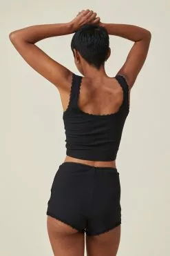 You’ll be off to the land of nod in style in the rib lace short. These fitted, shortie shorts are as cute as they are comfortable with lace trim detailing and ribbed fabrication.