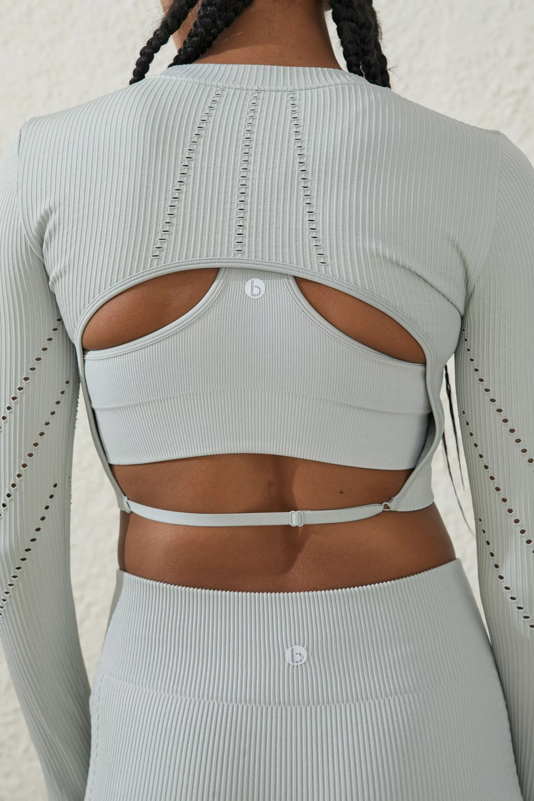 Long sleeve crop, High neck front and Back neck, Set in sleeves, Adjustable back strap, Seamless, Open back