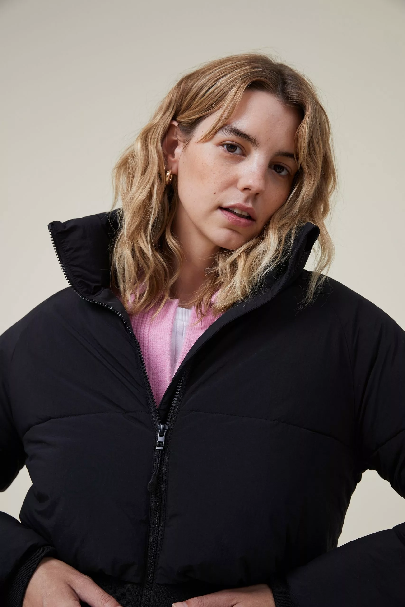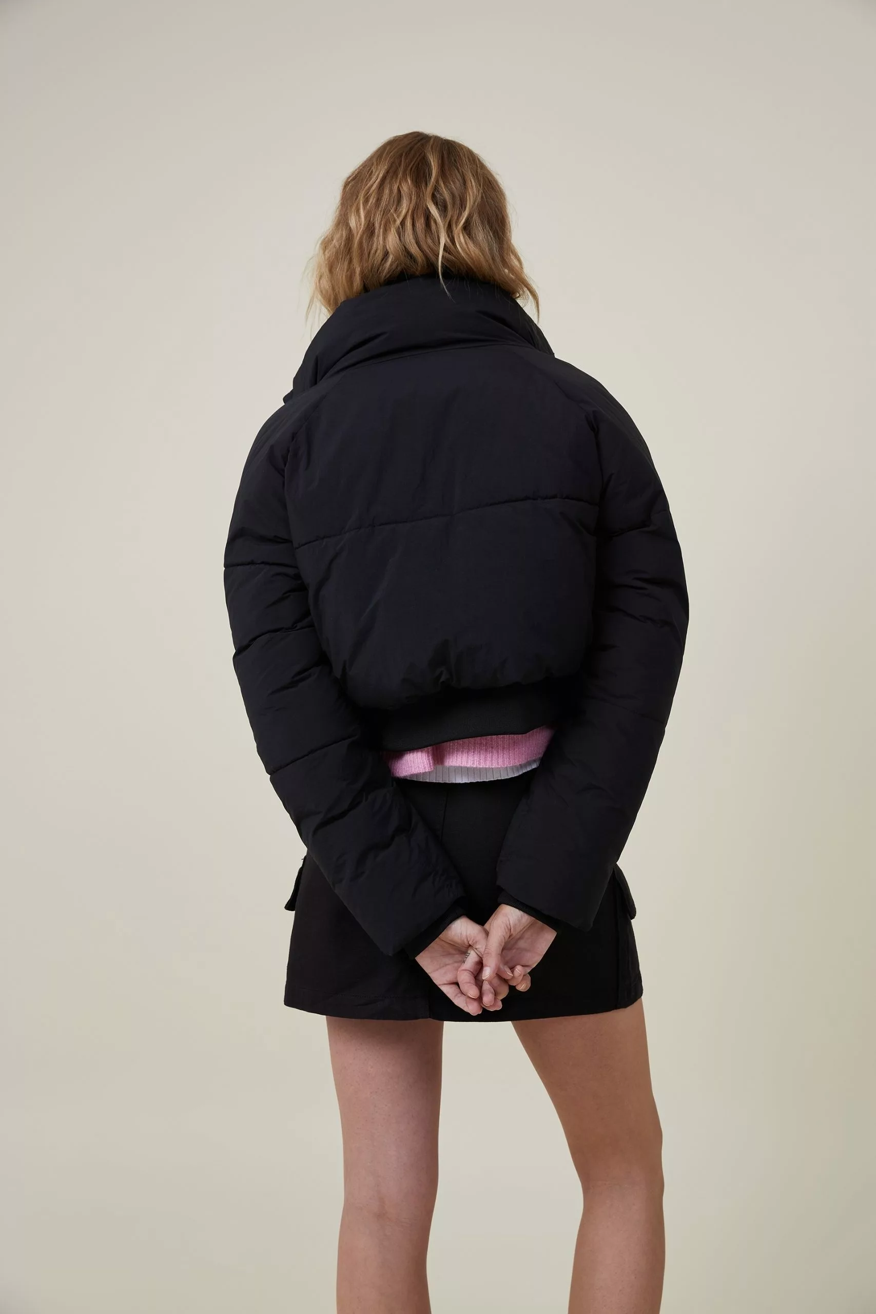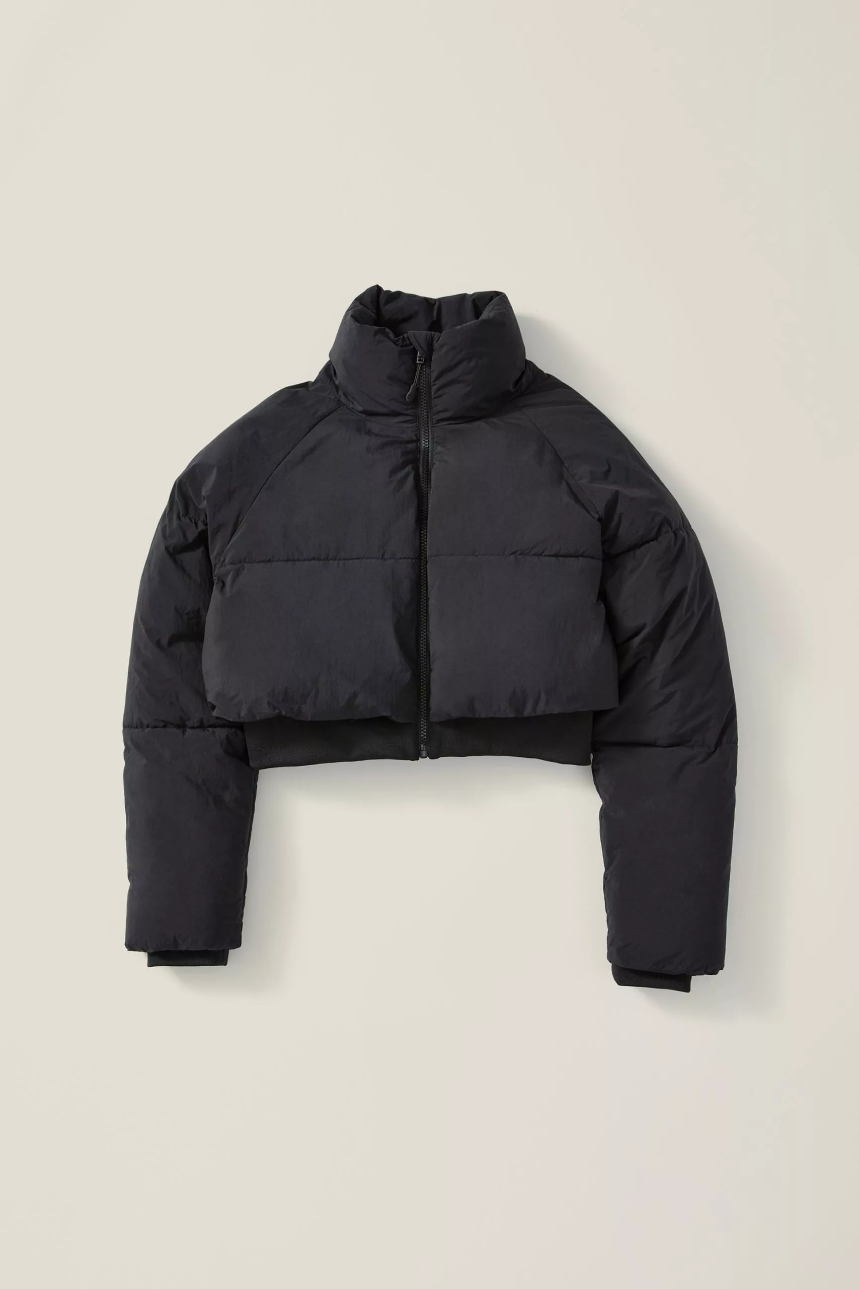 - Stretch ribbed cuffs and hem