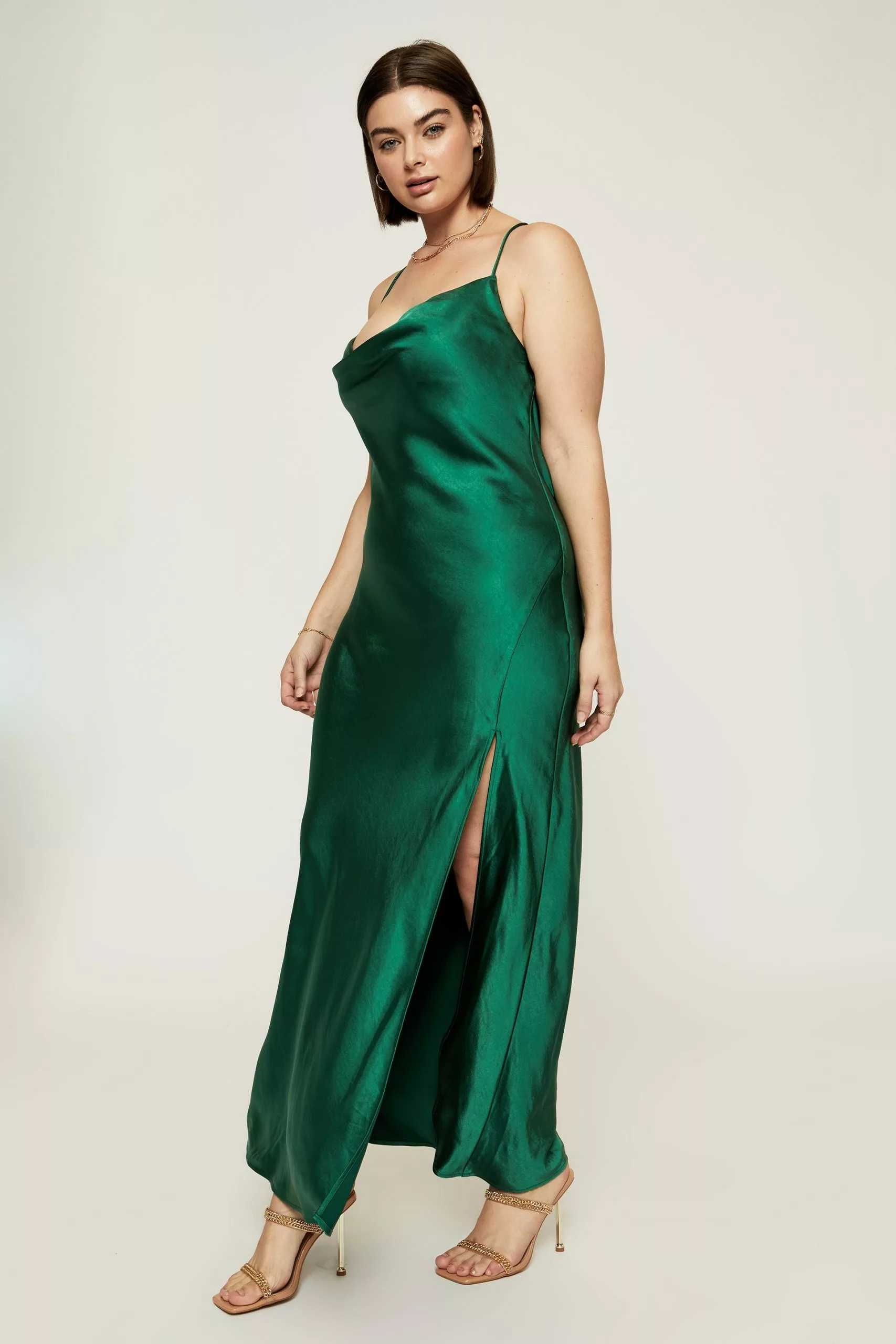 Crafted from a brilliant satin, the Caitlyn Cowl Neck Formal Dress features a timeless and flattering cowl neckline, thigh high split and adjustable low cowl back with lace up details. It is epitome of refined event dressing and is the perfect pairing for the bridal party, an engagement or any special occasion that you have been waiting to celebrate.