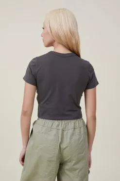 “The baby t-shirt is a serious wardrobe essential. A cropped, boxy fit that screams comfort, it pairs back perfectly with your fave high waisted denim. Pick it up in a range of trending colours for easy everyday styling.