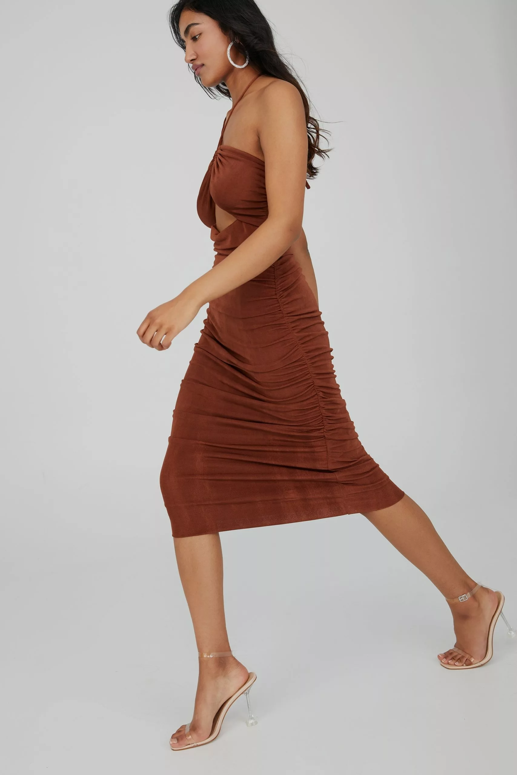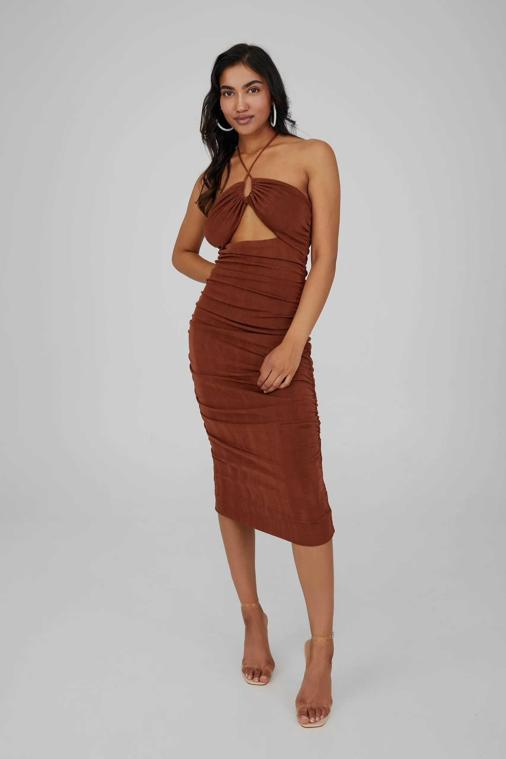 Featuring a fully lined, premium heavyweight slinky fabric and side ruching details, the Jasmine Strappy Ruched Midi Dress is designed to fit, hug and flatter for your next special event. A versatile staple and wardrobe must-have, this style includes a front cut out detail and can be worn two ways with its adjustable tie up neckline, so you can style as a classic halter, or create a crisscross statement.